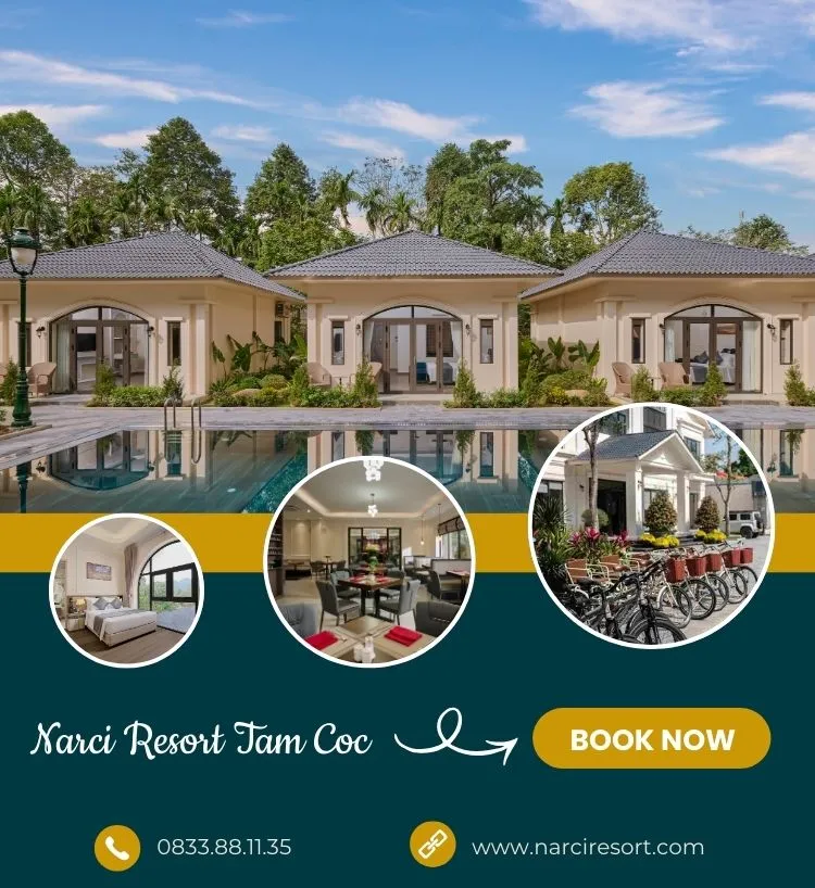 Tọa lạc tại trung tâm vùng danh thắng Tam Cốc – Bích Động, Narci Resort Tam Cốc mang đến không gian nghỉ dưỡng sang trọng, tinh tế và hòa hợp tuyệt đối với thiên nhiên. Được thiết kế theo phong cách kiến trúc Châu Âu hiện đại, kết hợp cùng những chi tiết lấy cảm hứng từ văn hóa Việt cổ, Narci Resort là điểm đến lý tưởng dành cho du khách tìm kiếm sự yên bình, thư thái và đẳng cấp giữa vùng đất di sản Ninh Bình.
